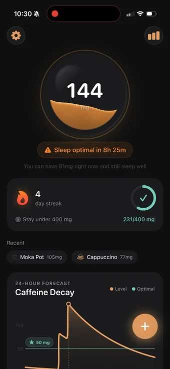 CaffPulse: Koffein Tracker ermöglicht es Ihnen, Ihren Koffeinspiegel über einen interaktiven Flüssigkeitsbehälter auf Ihrem Bildschirm zu überwachen. Sie können Ihr Telefon neigen und beobachten, wie es schwappt. Eine seiner besten Funktionen ist, dass es Ihnen sagt, wann Ihre Koffeinwerte niedriger sind und wann Sie schlafen sollten, um seine Auswirkungen zu vermeiden. Die Farbe des Flüssigkeitsbehälters ändert sich auch von bernsteinfarben zu teal, sobald Sie sichere Schlafniveaus erreichen.